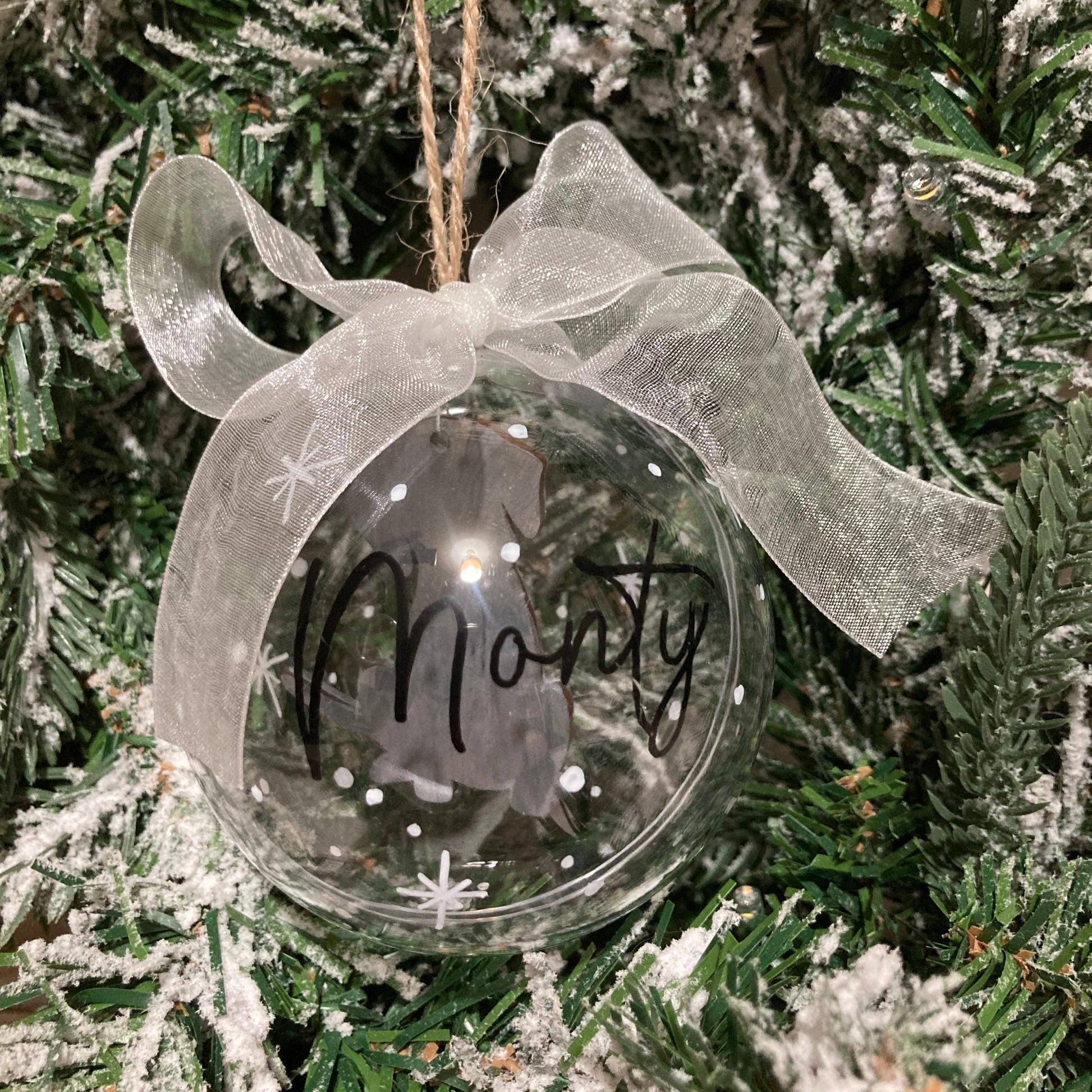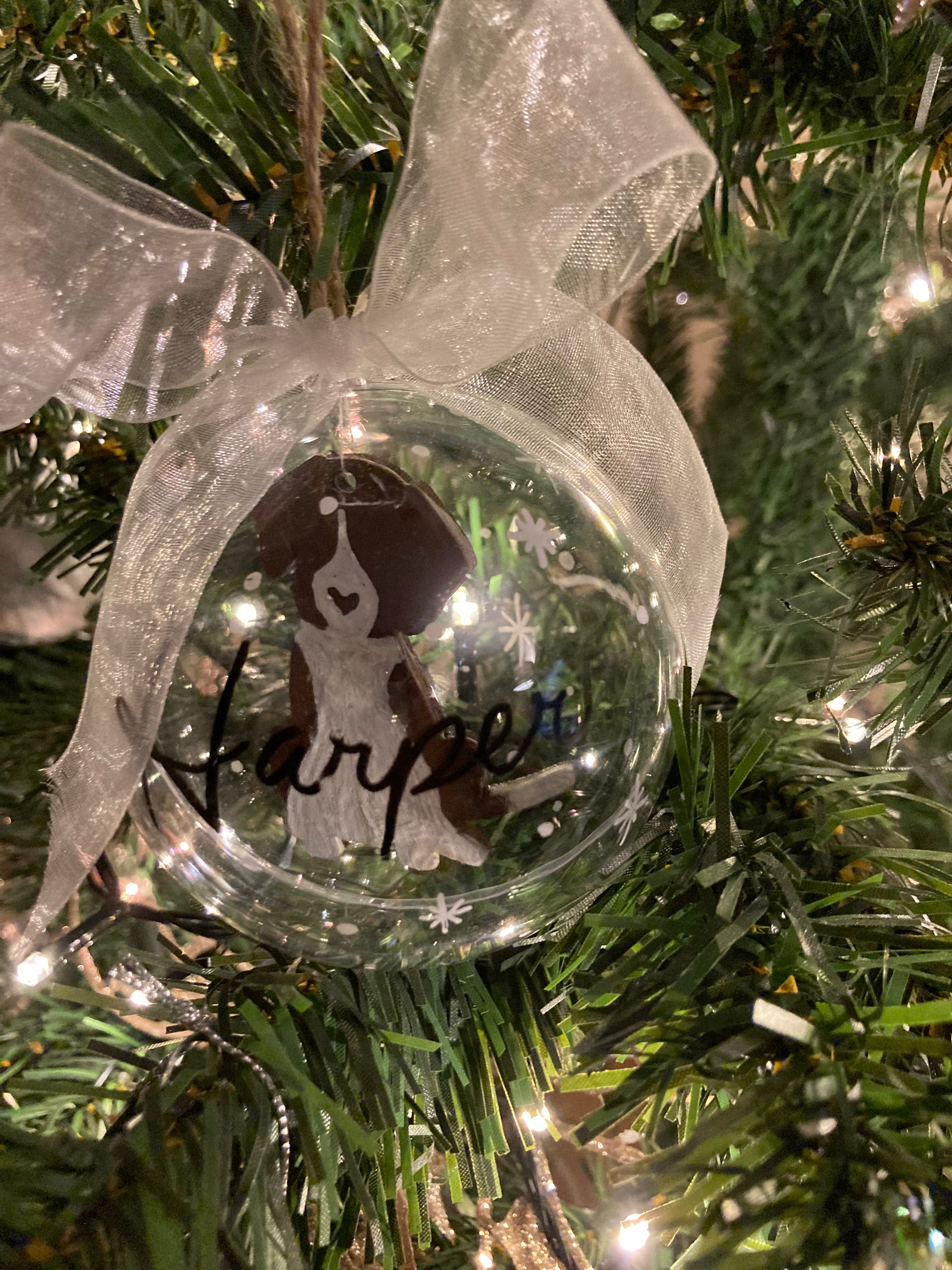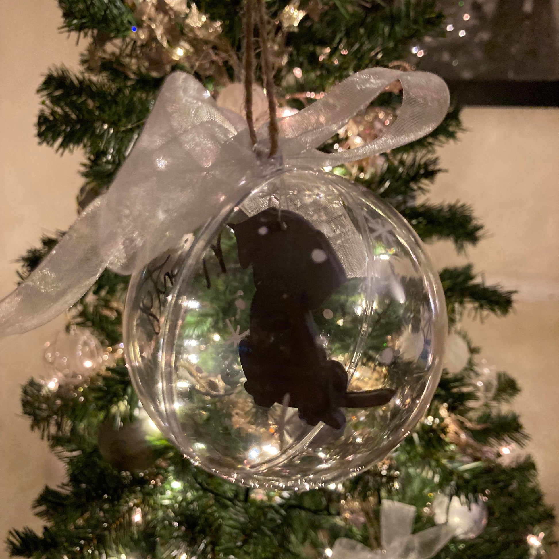 Celebrate the holiday season with our personalized dog Christmas bauble, featuring a painted dog inside painted to your pets colouring, their name and an elegant white bow. Crafted from durable plastic, this ornament is not only a delightful addition to your festive decor but also a unique way to showcase your love for your feline friend.